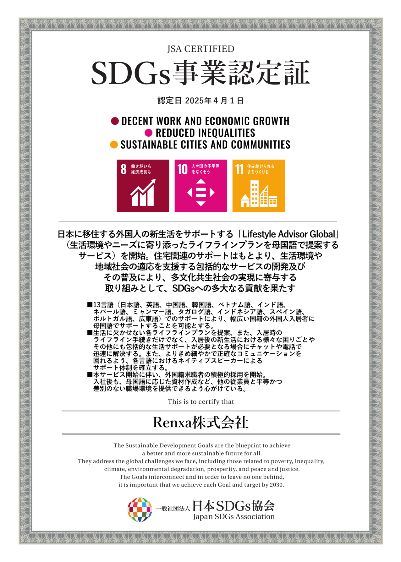日本に移住する外国人の新生活をサポートする「Lifestyle Advisor Global」(生活環境やニーズに寄り添ったライフラインプランを母国語で提案するサービス)を開始。住宅関連のサポートはもとより、生活環境や地域社会の適応を支援する包括的なサービスの開発及びその普及により、多文化共生社会の実現に寄与する取り組みとして、SDGsへの多大なる貢献を果たす
