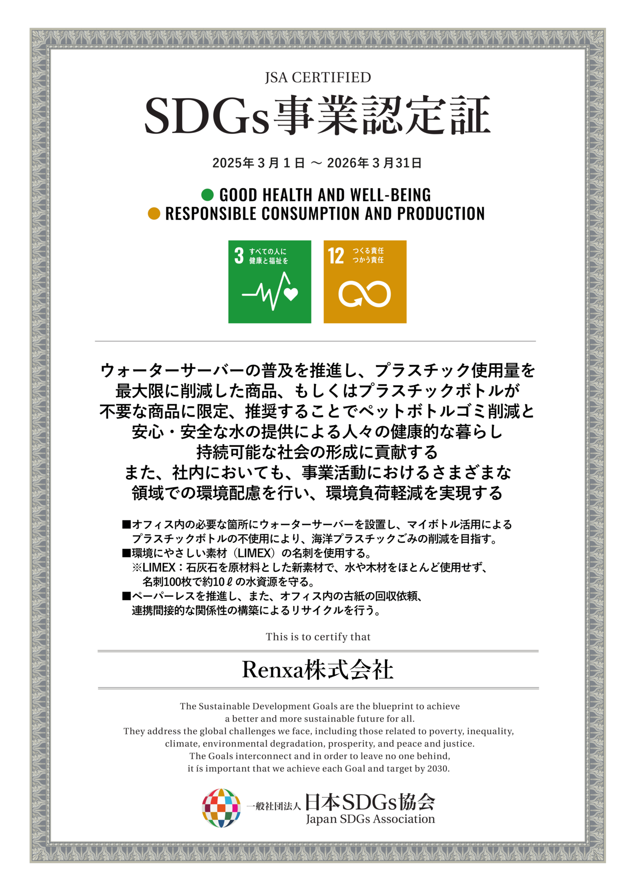 もしくはプラスチックボトルが不要な商品に限定、推奨することでペットボトルゴミ削減と安心・安全な水の提供による人々の健康的な暮らし、持続可能な社会の形成に貢献する。